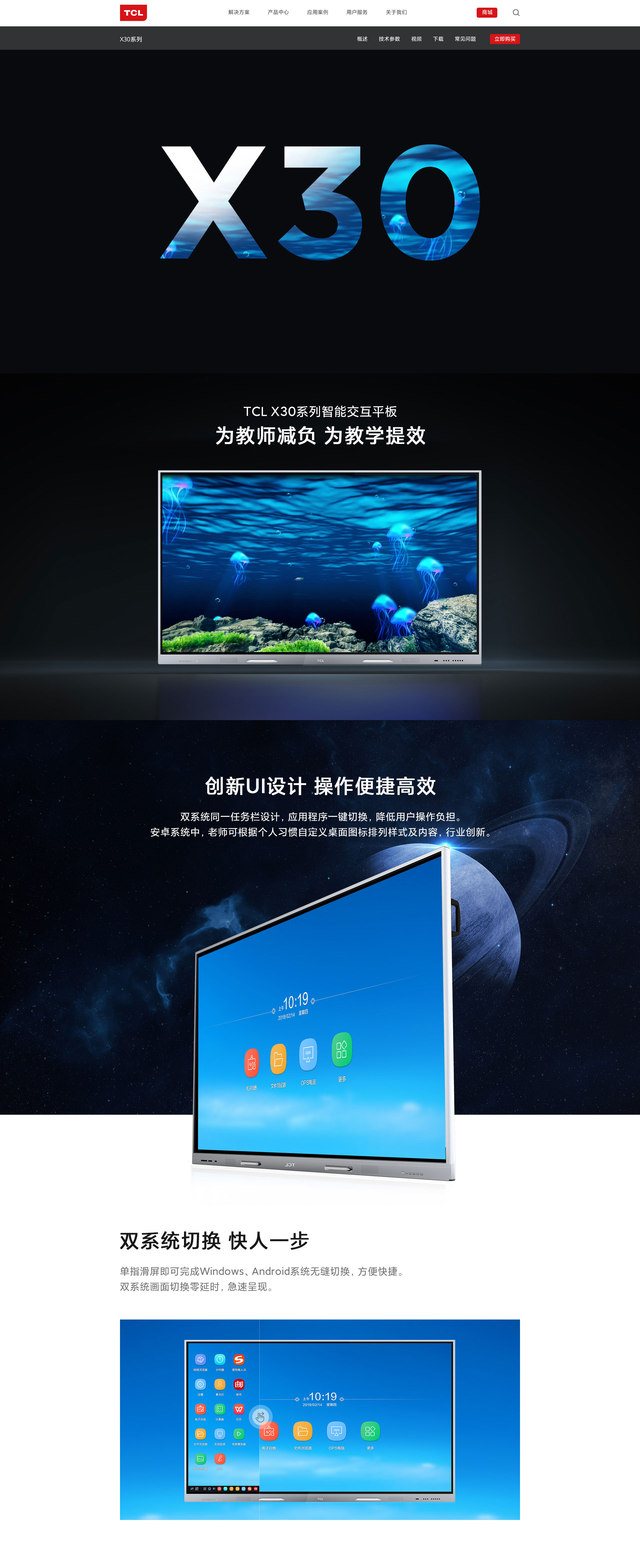 廣州網站建設邁創設計師為TCL企業網站進行頁面設計時在色彩的選用上頗為講究,主色調采用“黑藍色”為主要背景色,突出科技企業的品牌形象和產品特點。以全新的滑動動畫理念,完美體驗品牌標識性,通過互聯網對外傳播更具統一性,整體形象更深入用戶心理。