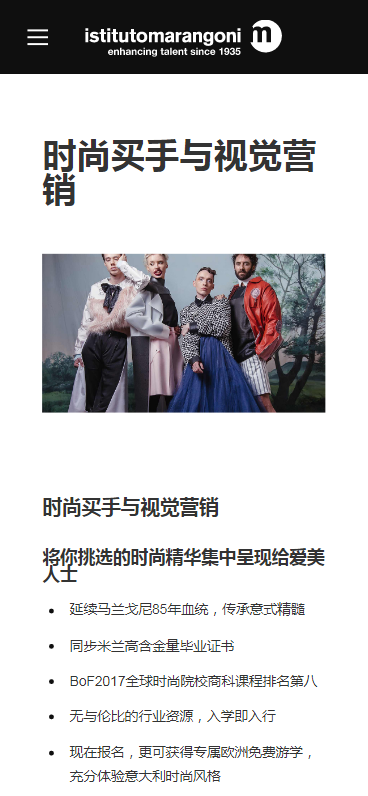 馬蘭戈尼學院(馬蘭歐尼學院)1935年在米蘭建立,建校83年來致力于培養時裝和設計行業高級人才,在全球時尚產業內享有極高聲譽,在2016年時尚類院校多個國際排名中位列世界一流、意大利第一, 2017年BoF時尚商務類課程全球排名第八。